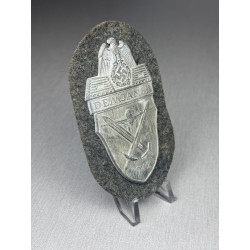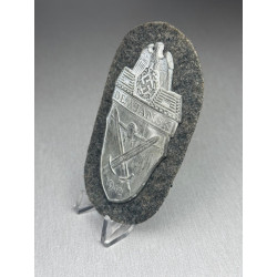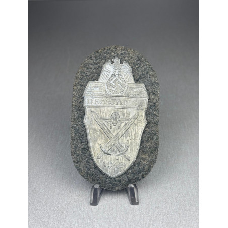 A complete and unissued German "DEMJANSK" campaign shield, awarded to all those who had survived the encirclement by Soviet troops in 1942. This version with grey backing could be used by either Heer or Luftwaffe troops. A nice complete shield with most of its original backing and finish.