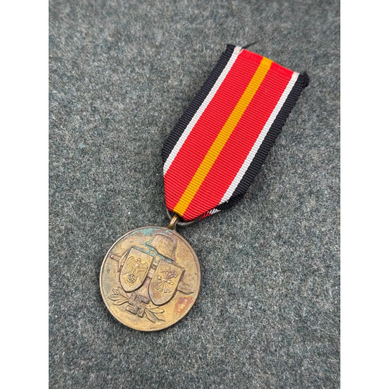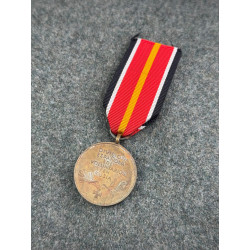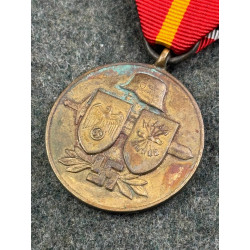 This unissued German WW2 manufactured medal was awarded to Spanish soldiers who had participated in the Blue Division, a military unit composed of Spanish volunteers who had gone to the eastern front to combat against communism. An overall nice design, the body of the medal shows a light patina, but the ribbon remains in overall clean condition.
