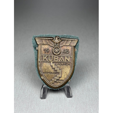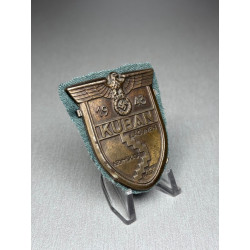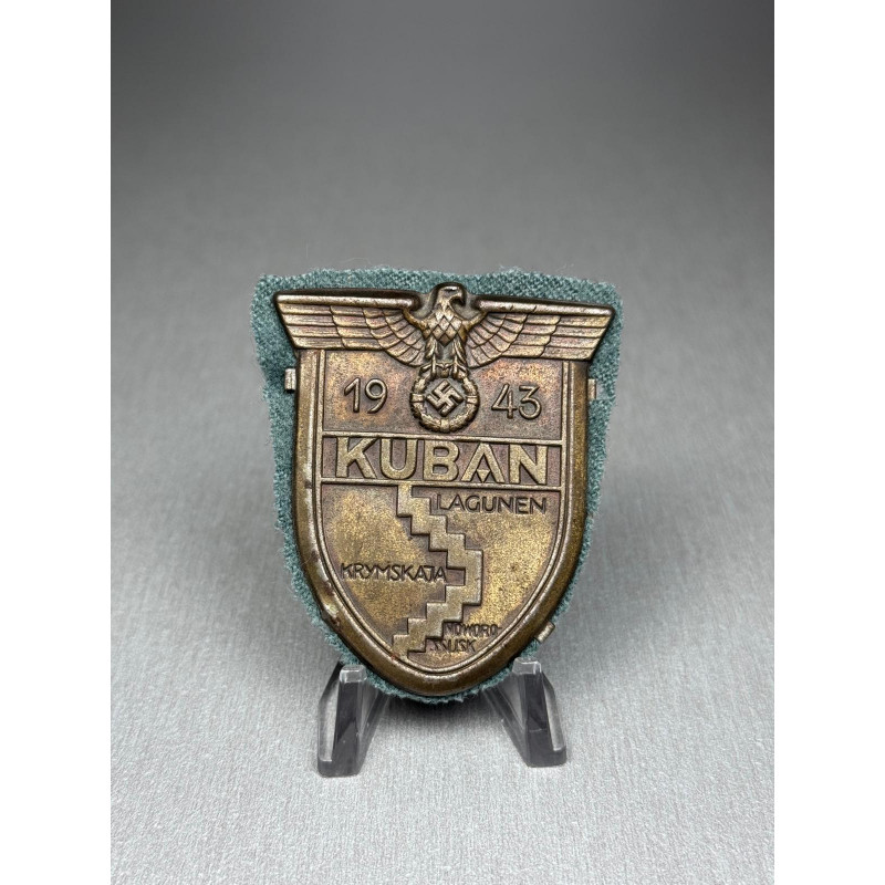 A nice German "KUBAN" campaign sleeve shield, awarded to those who survived this dangerous campaign. Seems to have been uniform removed, retaining some of the back cloth.