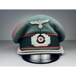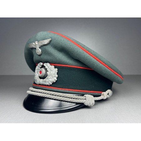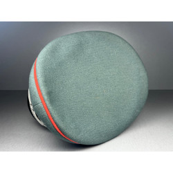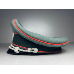 One from our personal archives, now available for sale. This is a very clean German army artillery officers visor hat. Complete and void of damage other than a couple tiny pin size holes on the top (not noticeable whatsoever), the cap has a very rich green colour and the inside is only missing the celluloid piece, more than likely removed by the original owner for comfort (based off of how clean the cap is, doesnt seem as if the celluloid would have broken or gotten damaged). A stunner, we have enjoyed it for many years and now we offer the chance for others to enjoy it too!