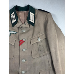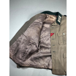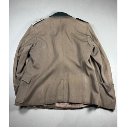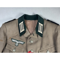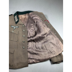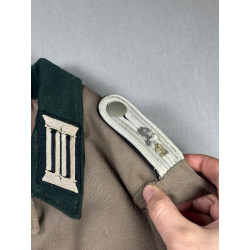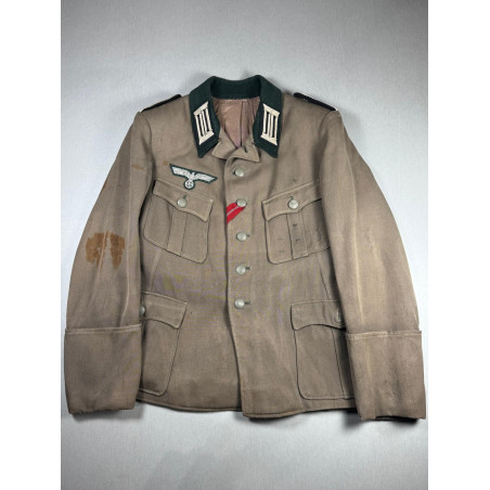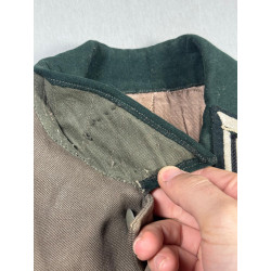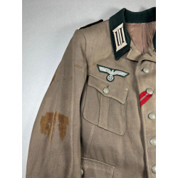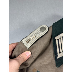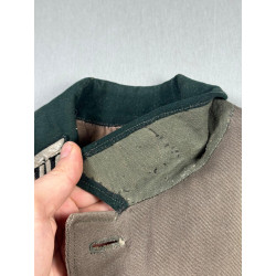 Another "been there, done that" style of tunic in this update. This German officers pioneer/engineer tunic seems to be made from some sort of captured/foreign material. The insignia seem to have been placed there as either an upgrade or straight from another tunic. We would describe this as almost a "field made" tunic. The condition is overall good, with a rust type stain on one sleeve. On one button, a Soviet Invasion medal ribbon can be spotted.