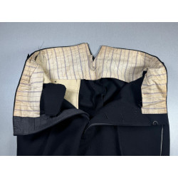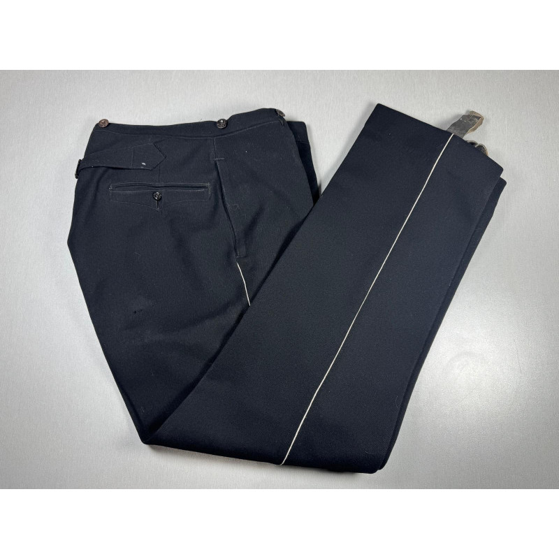 A stunning pair of original German Allgemeine SS trousers. This particular model is the straight leg and pipped version, for walking out or parade. They are made of a very high quality black tricot and show no sign of wear other than a small nip to the right buttock. At the bottom of the trouser, two pull-tabs are used to secure the trousers to the boots.